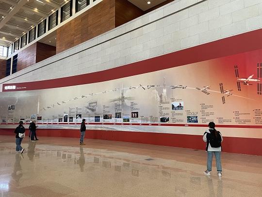 瀏覽“載人航天精神和文化”展板,上面布滿了“精神傳承”和“英模人物”的圖片,“授予:長征七號遙六試驗(yàn)隊(duì)成功”等鮮紅的錦旗,醒目地懸掛在展板上方。