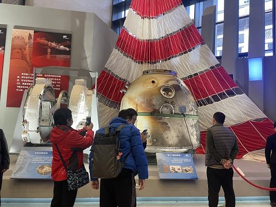 圖為參觀者觀看神舟十三號返回艙實(shí)物。
