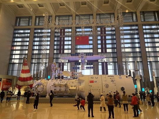 在這次成就展上,天和核心艙1:1模型最為亮眼。參觀者好奇地圍繞模型仔細(xì)觀看,并拍照留念。在天和核心艙模型上方,抬頭可見空間站組合體1:4模型。