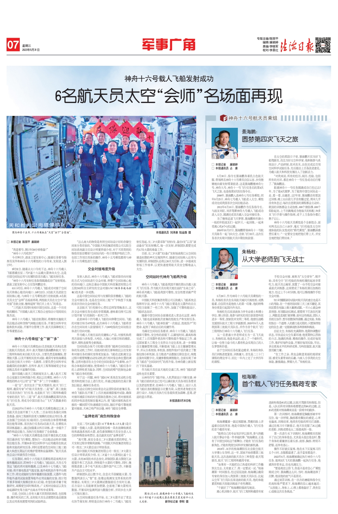 神舟十六號(hào)航天員乘組由1名首批航天員和2名第三批航天員組成。其中,航天駕駛員景海鵬和航天飛行工程師朱楊柱來自航天員大隊(duì),主要負(fù)責(zé)直接操縱、管理航天器,以及開展相關(guān)技術(shù)試驗(yàn)。載荷專家桂海潮是北京航空航天大學(xué)的一名教授,主要負(fù)責(zé)空間科學(xué)實(shí)驗(yàn)載荷的在軌操作,在科學(xué)、航天工程等領(lǐng)域受過專業(yè)訓(xùn)練且具有豐富操作經(jīng)驗(yàn)。