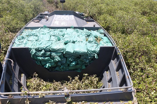 無人機(jī)始終鎖定目標(biāo)、執(zhí)法艇在后窮追不舍,歷時(shí)2個(gè)小時(shí)將走私摩托艇逼進(jìn)紅樹林?jǐn)R淺。經(jīng)檢查,該摩托艇載有凍雞爪一批,現(xiàn)場未發(fā)現(xiàn)該批凍雞爪合法手續(xù)及相關(guān)證明,涉嫌走私。經(jīng)清點(diǎn),該批凍雞爪5.3噸,案值約20萬元。