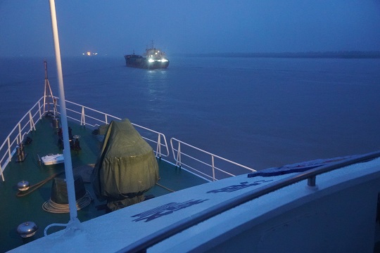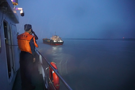 6月18日8時,上海海警局執(zhí)法艇在長江口南槽航道附近海域巡邏時,發(fā)現(xiàn)一艘貨船使用的是篡改后的AIS,屬于“套牌船”。執(zhí)法艇靠前對其進(jìn)行喊話示警,并登臨檢查該船。經(jīng)查,該船共有6名船員,裝載牛肚等凍品約200噸,案值約2000萬元。