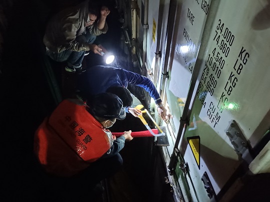 圖為執(zhí)法人員開啟裝載凍品集裝箱。