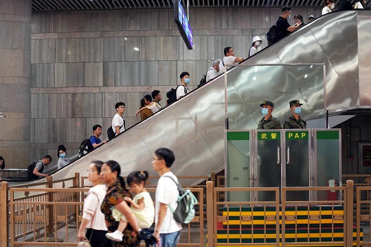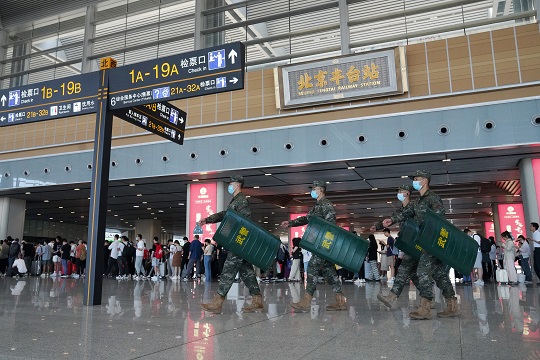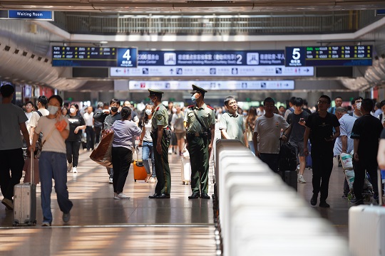 “結(jié)合持續(xù)高溫天氣和客流量增多帶來(lái)的執(zhí)勤壓力,我們及時(shí)對(duì)勤務(wù)部署進(jìn)行優(yōu)化,增派巡邏哨兵觀察上報(bào)客流情況并積極為旅客提供暖心服務(wù),安排專(zhuān)人到哨位送清涼減輕惡劣天候影響,確保執(zhí)勤任務(wù)圓滿完成、確保旅客能夠安全順利出行?!北本┪髡臼匦l(wèi)分隊(duì)指導(dǎo)員劉冠群說(shuō)。