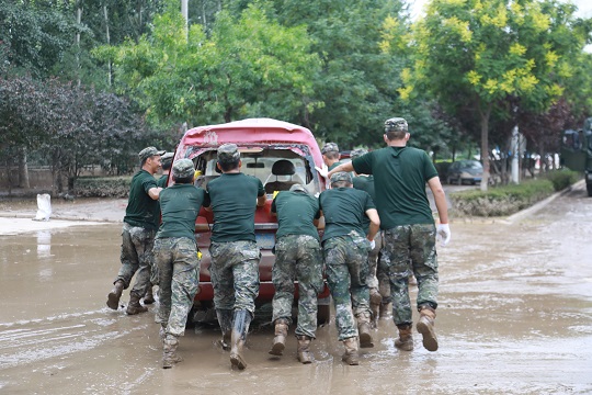 圖為武警河北總隊保定支隊官兵趕赴河北淶水受災(zāi)現(xiàn)場。