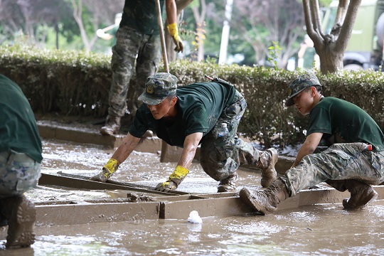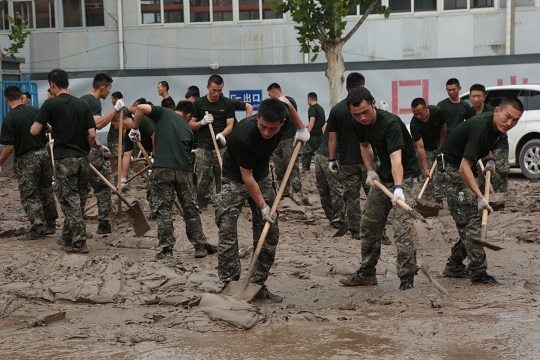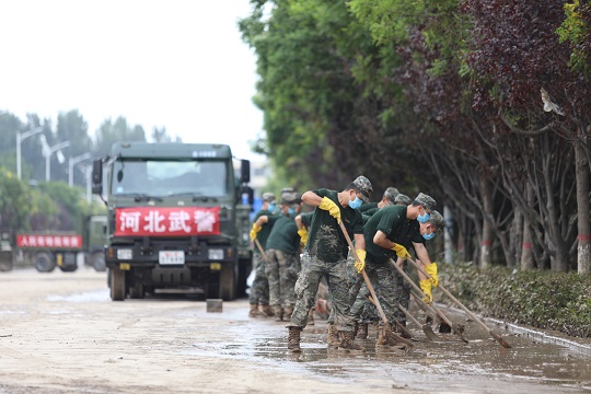 圖為武警河北總隊機動支隊官兵在河北涿州市騰飛大街清理淤泥。江騰 攝