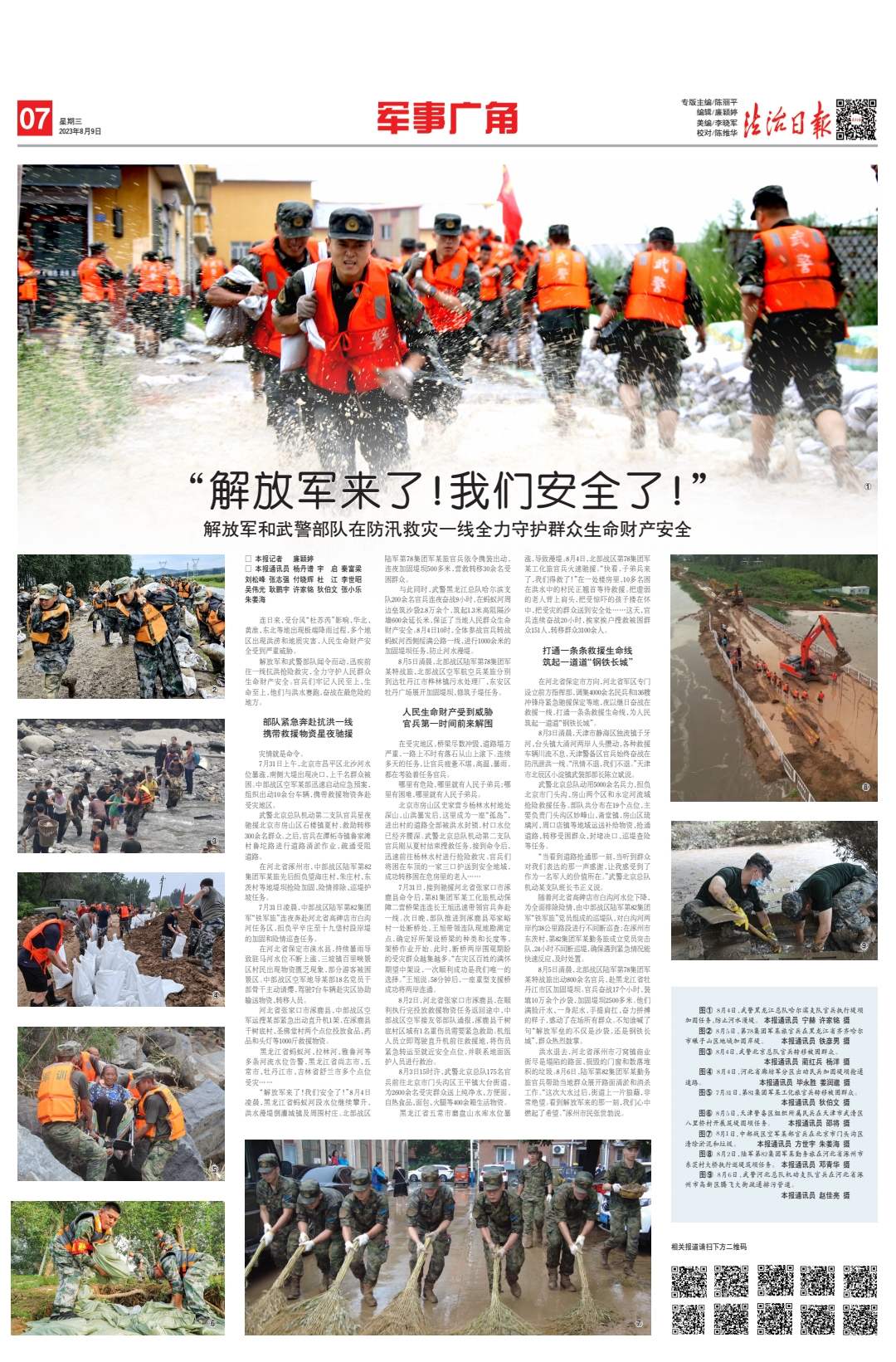 解放軍和武警部隊(duì)聞令而動(dòng),迅疾前往一線抗洪搶險(xiǎn)救災(zāi),全力守護(hù)人民群眾生命財(cái)產(chǎn)安全。官兵們牢記人民至上、生命至上,他們與洪水賽跑,奮戰(zhàn)在最危險(xiǎn)的地方。