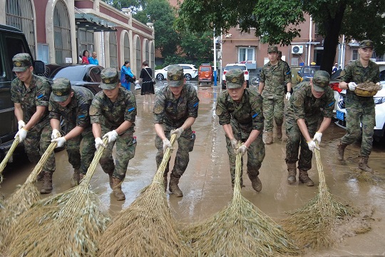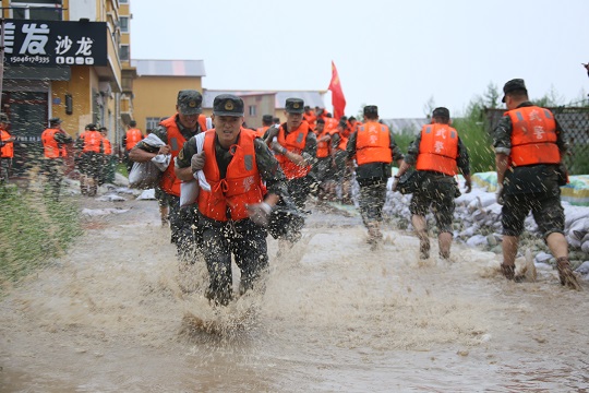 8月5日清晨,北部戰(zhàn)區(qū)陸軍第78集團(tuán)軍某特戰(zhàn)旅出動(dòng)800余名官兵,赴黑龍江省牡丹江市區(qū)加固堤壩。官兵奮戰(zhàn)17個(gè)小時(shí),裝填10萬(wàn)余個(gè)沙袋,加固堤壩2500多米。他們滿臉汗水、一身泥水,手提肩扛、奮力拼搏的樣子,感動(dòng)了在場(chǎng)所有群眾。不知誰(shuí)喊了句“解放軍壘的不僅是沙袋,還是鋼鐵長(zhǎng)城”,群眾熱烈鼓掌。