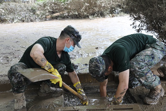 圖為8月1日,中部戰(zhàn)區(qū)空軍某部官兵在北京市門頭溝區(qū)清除淤泥和垃圾。本報(bào)通訊員 方世宇 朱姜海 攝