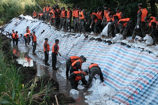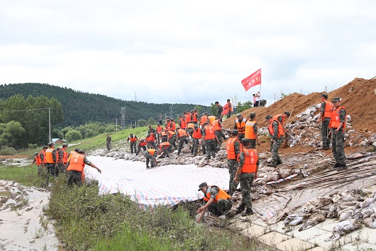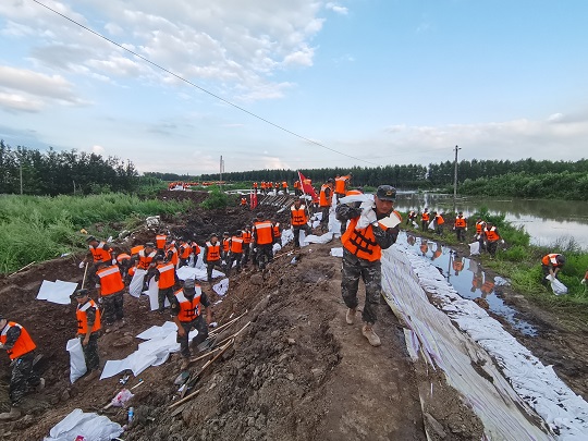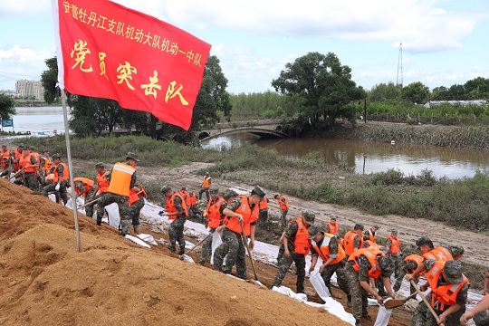 8月9日,武警黑龍江總隊(duì)出動(dòng)500余名官兵對(duì)哈爾濱、牡丹江等地河流堤壩進(jìn)行防水加固。