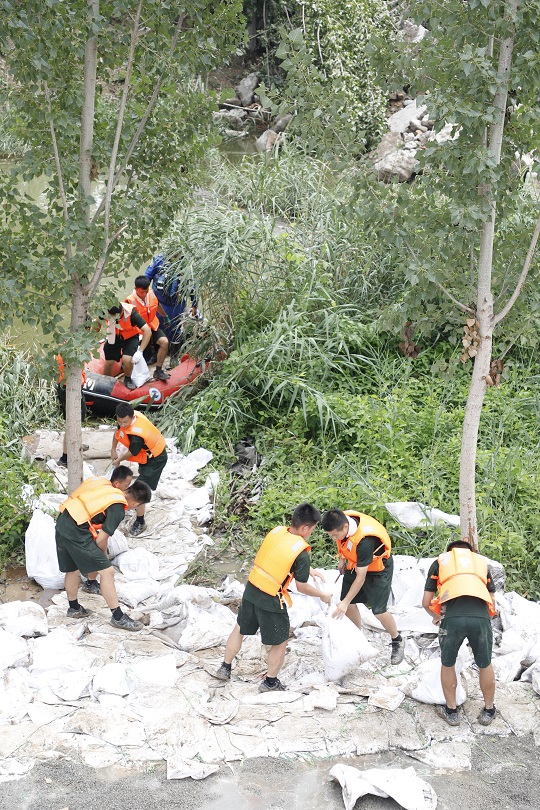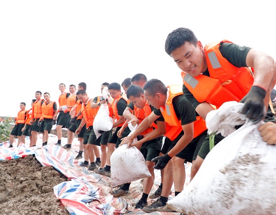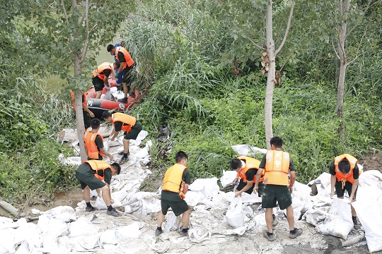 圖為官兵們正在轉(zhuǎn)運(yùn)沙袋。