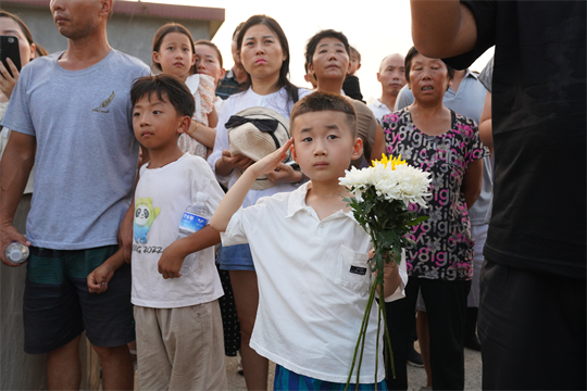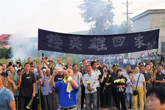 8月16日,跨越近2000公里,吉林省舒蘭市人民武裝部上校政治委員周昆訓(xùn)烈士“回”到家鄉(xiāng)河南省確山縣。在高速公路口、街道兩旁、竹溝革命烈士陵園門前,當(dāng)?shù)馗刹咳罕娛峙蹙栈?,迎接忠魂歸來(lái)。
