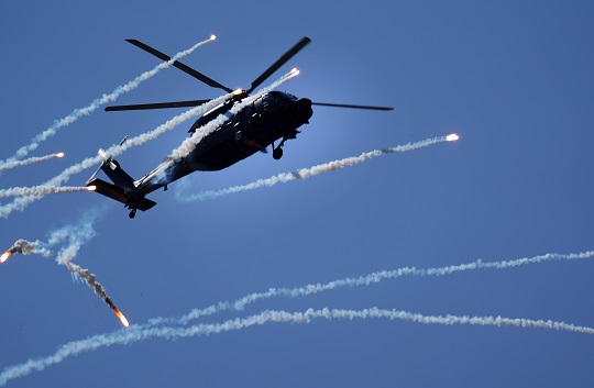 圖為陸軍“風雷”飛行表演隊直-20戰(zhàn)術通用直升機發(fā)射干擾彈。張永進 攝