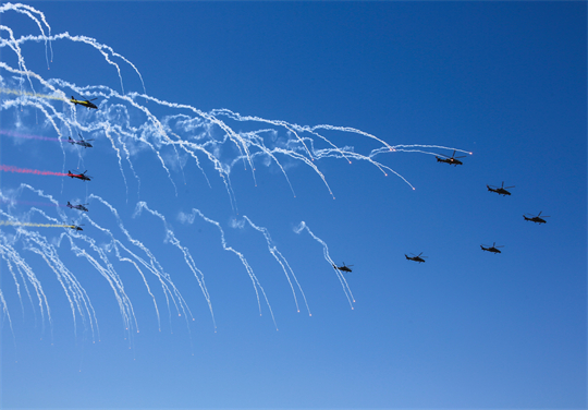 在開幕式的飛行表演環(huán)節(jié),陸軍“風雷”飛行表演隊以“八一”字樣通場飛行拉開帷幕,先后向觀眾演示了軍魂永駐、三機芭蕾、筑夢追心、尾追螺旋等8個課目的特技飛行動作,精彩絕倫的表演讓現(xiàn)場觀眾掌聲不斷,充分展示了陸軍航空兵部隊轉型建設和實戰(zhàn)化訓練成效。