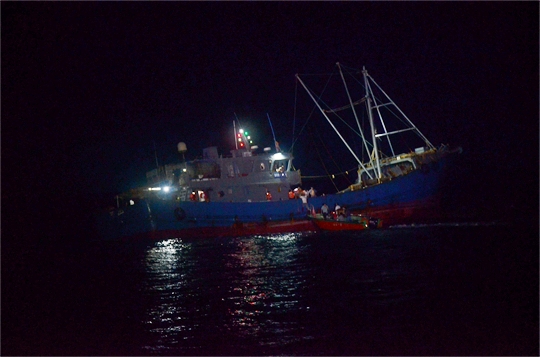 9月20日晚,廣東海警局在廣東陽江黃程山島附近海域救助一艘觸礁擱淺漁船,船上載有26名漁民。