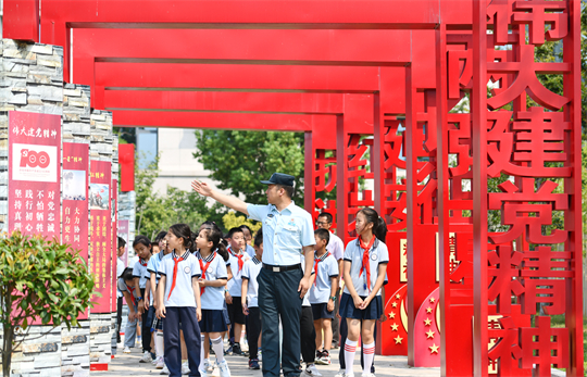 圖為在武警合肥支隊執(zhí)勤某大隊營區(qū),小學生在參觀黨史軍史長廊。