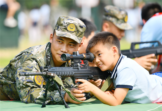 圖為在武警合肥支隊執(zhí)勤某大隊營區(qū),小學生在戰(zhàn)士的指導下體驗武器裝備。