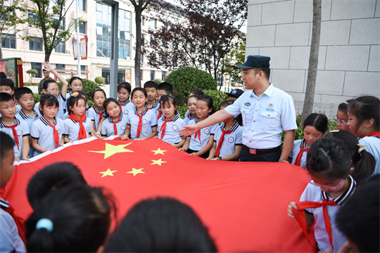圖為在武警合肥支隊執(zhí)勤某大隊營區(qū),文職人員王帝在向小學生介紹國旗知識。