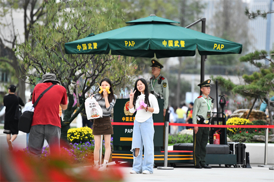 圖為9月26日,在第十四屆中國(合肥)國際園林博覽會現場,武警執(zhí)勤官兵為游客提供便民服務。