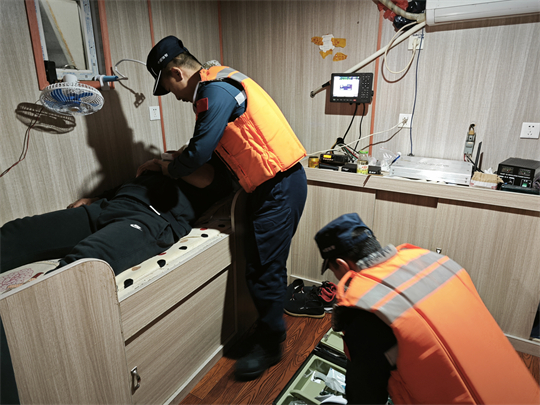 接到信息后,海警執(zhí)法艇迅速鎖定該漁船位置并前往救助,當(dāng)日19時(shí)10分成功靠幫該漁船。隨船衛(wèi)生員對(duì)病人進(jìn)行血壓檢測(cè)后,發(fā)現(xiàn)其血壓明顯超出正常值,需立即送醫(yī)救治。海警執(zhí)法員隨即將該漁民過(guò)駁至艇上進(jìn)行前期救治,同時(shí)協(xié)調(diào)救護(hù)車做好運(yùn)送病人準(zhǔn)備。