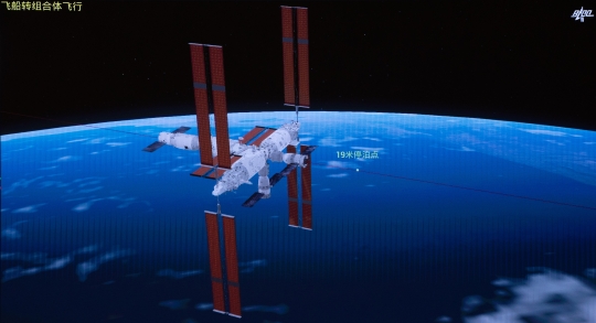 圖為10月26日在北京航天飛行控制中心拍攝的神舟十七號(hào)載人飛船和空間站天和核心艙前向端口對(duì)接過程的畫面。新華社記者 金立旺 攝