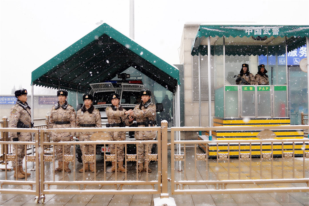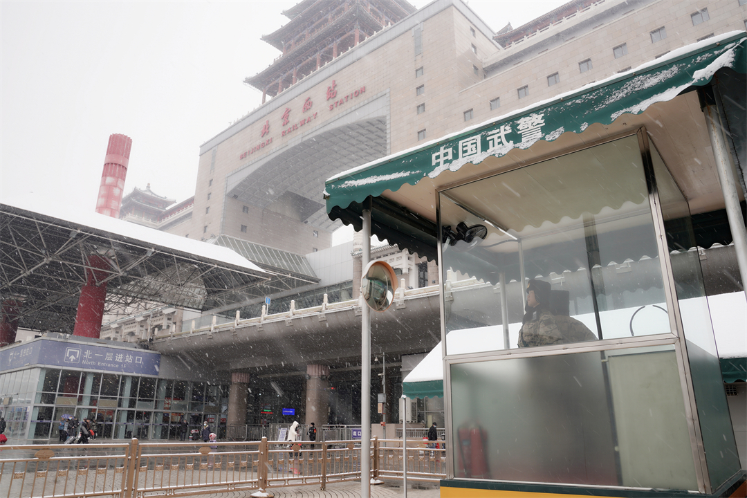 盡管降雪比較大,北京西站南北廣場、豐臺站仍然有不少旅客冒雪出行。武警官兵堅守在執(zhí)勤崗位,時刻觀察著周邊情況,積極熱情為旅客提供幫助,確保大家安全有序出行。