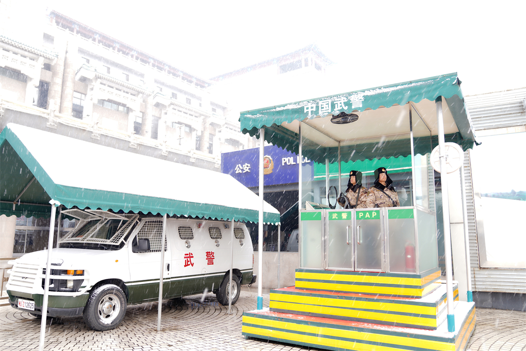 圖為執(zhí)勤武警佇立在哨位上就是一道安全屏障。