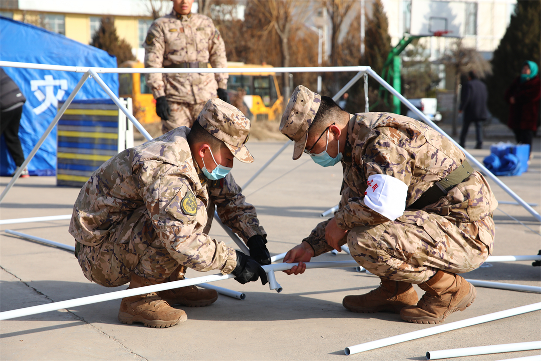 圖為武警青海總隊任務(wù)官兵正搭建救援帳篷。