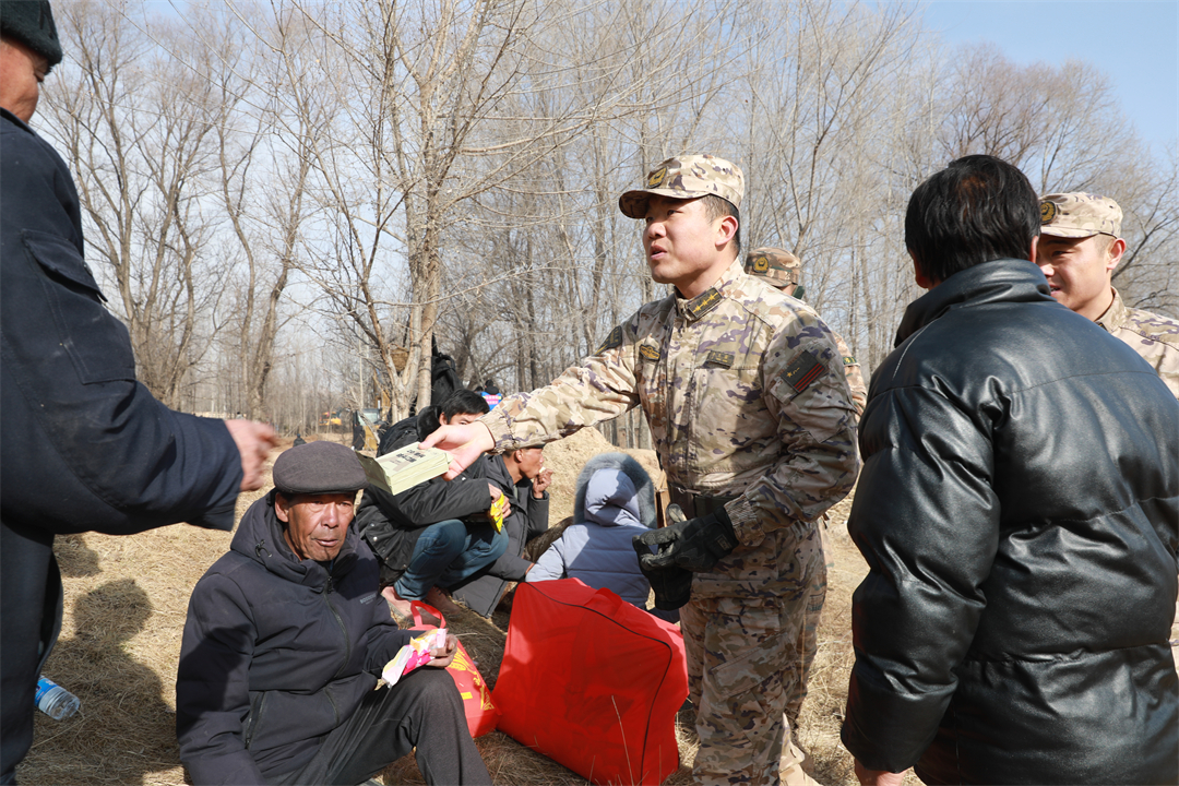 圖為武警青??傟犎蝿?wù)官兵為群眾分發(fā)自熱食品。
