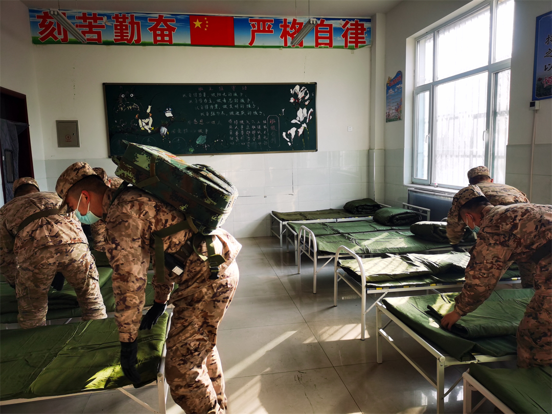 圖為武警青??傟犎蝿?wù)官兵正布置臨時安置點。