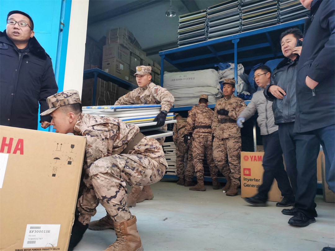 圖為武警青海總隊任務(wù)官兵正卸下救援物資。