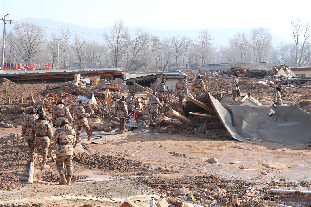 圖為12月20日,武警青??傟牂C動一支隊官兵在青海省海東市民和縣中川鄉(xiāng)草灘村泥石流現(xiàn)場進行搜救。羅元凱 攝