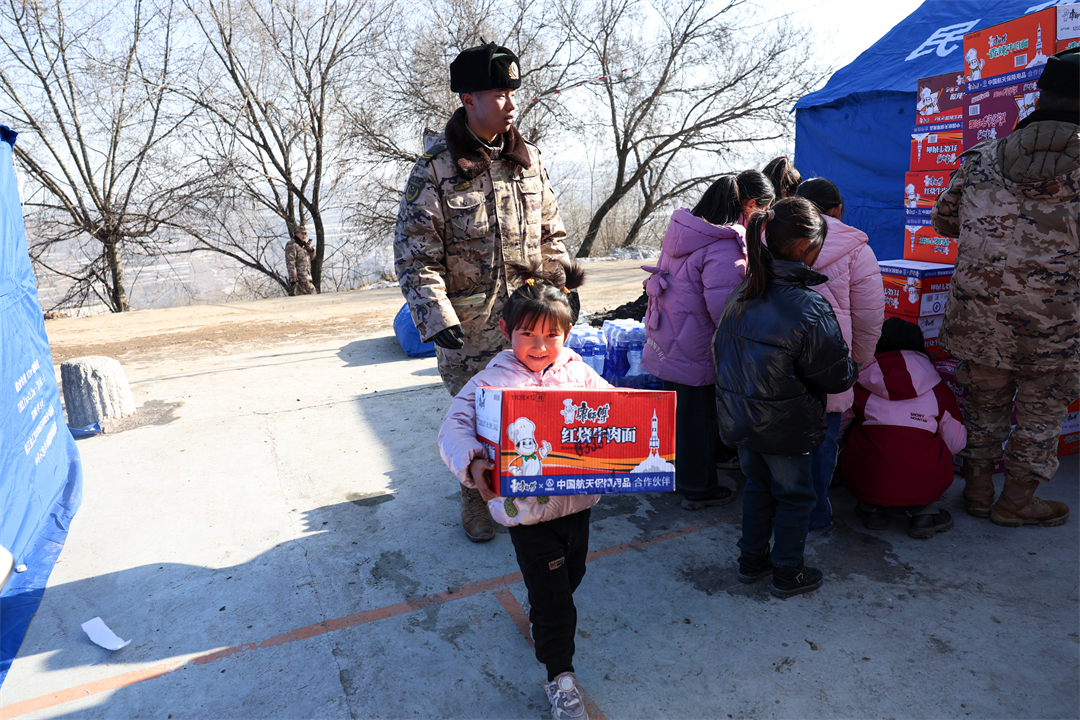圖為12月21日,在甘肅省臨夏州積石山縣劉集鄉(xiāng)陽屲村安置點,小朋友們吃著武警甘肅總隊臨夏支隊官兵制作的熱食,臉上露出了幸福的笑容。