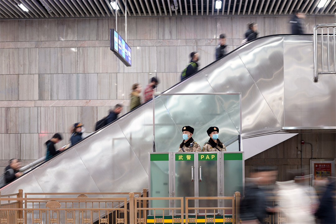 圖為北京西站南廣場(chǎng)武警正在認(rèn)真履職。