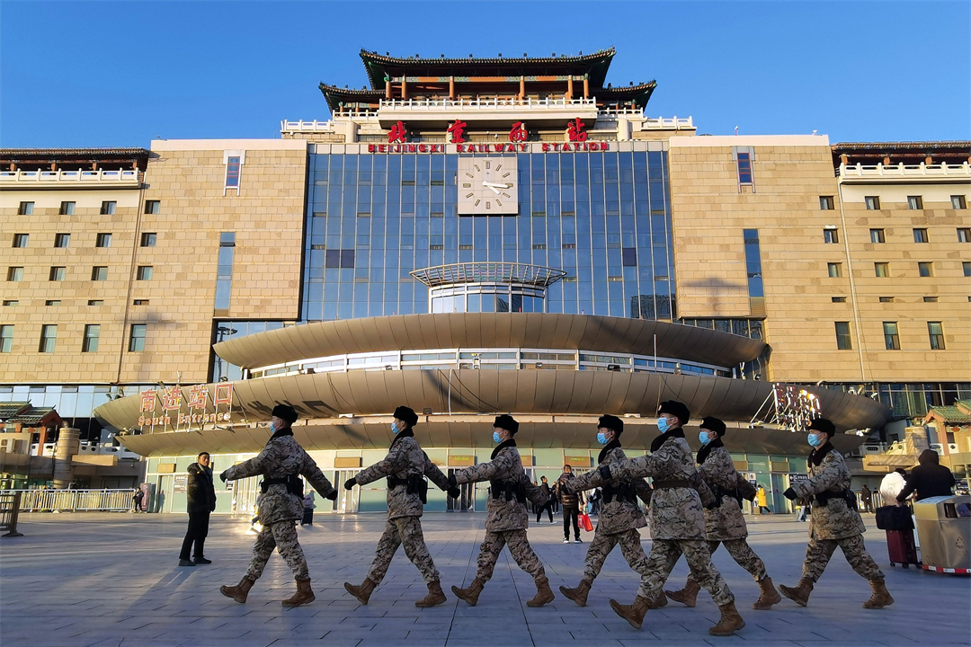 圖為北京西站南廣場(chǎng)旅客人頭攢動(dòng),武警官兵警惕執(zhí)勤。