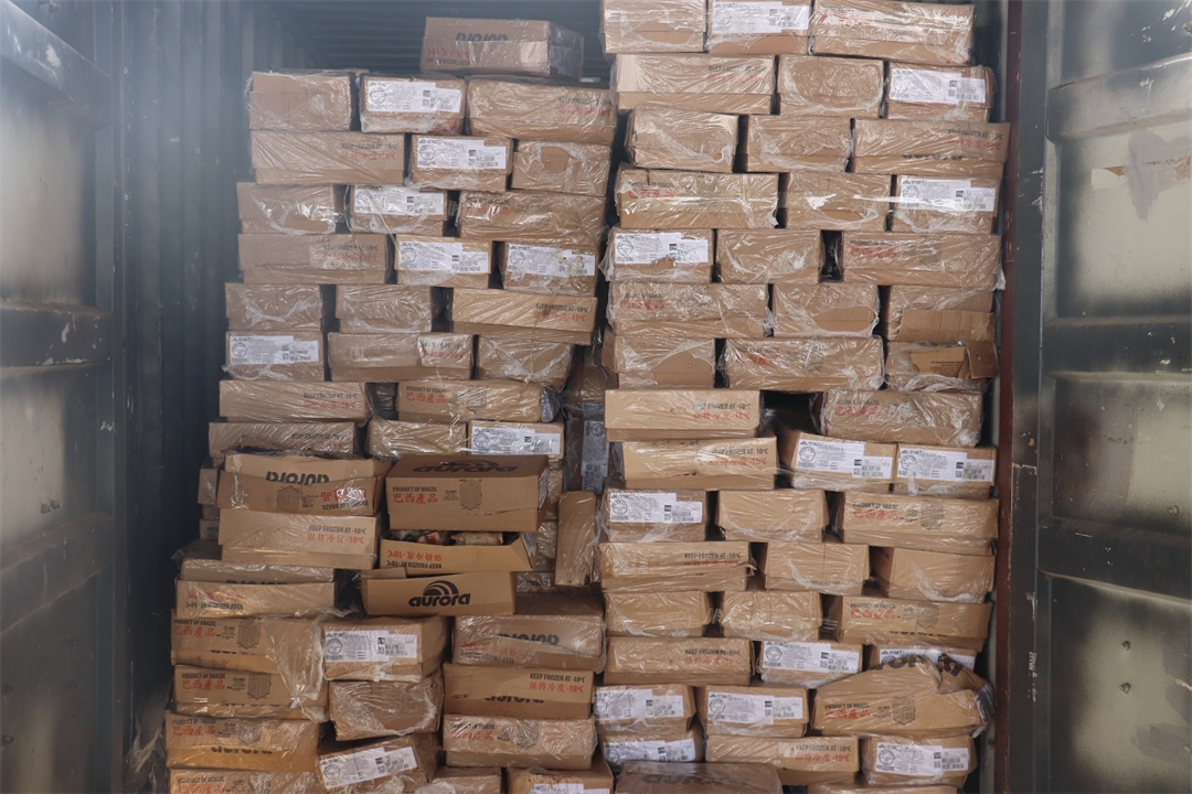 圖為集裝箱內(nèi)裝滿應(yīng)節(jié)凍品。