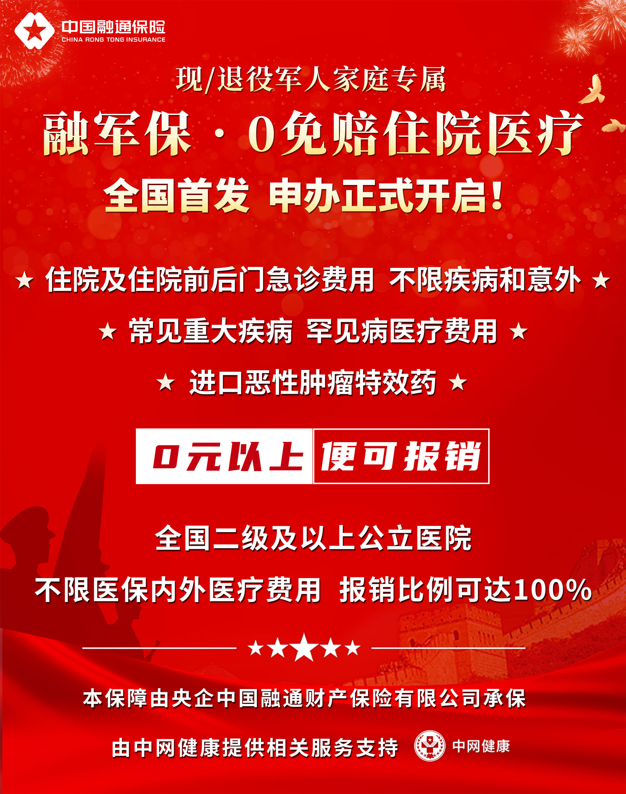 為深入貫徹落實(shí)黨的二十大關(guān)于退役軍人工作重要部署,履行“為軍惠軍”職責(zé)使命,體現(xiàn)中央企業(yè)服務(wù)經(jīng)濟(jì)社會(huì)高質(zhì)量發(fā)展的“國家隊(duì)、排頭兵”作用,進(jìn)一步提升退役軍人保險(xiǎn)保障水平。中國融通保險(xiǎn)發(fā)揮自身為軍服務(wù)“專門化、專業(yè)化”服務(wù)優(yōu)勢,聚焦現(xiàn)/退役軍人家庭醫(yī)療現(xiàn)實(shí)需求,于2024年3月14日,聯(lián)合中網(wǎng)健康正式上線了《融軍?!?免賠住院醫(yī)療》保險(xiǎn)產(chǎn)品。此產(chǎn)品由中國融通保險(xiǎn)全面負(fù)責(zé)定制研發(fā),由中網(wǎng)健康提供相關(guān)配套服務(wù)支持。該保險(xiǎn)因其“0免賠”的保障優(yōu)勢,真正實(shí)現(xiàn)了“看病住院,小錢、大錢均可報(bào)銷”。