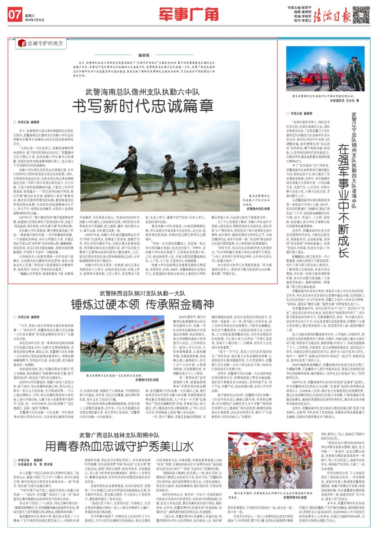 近日,武警部隊政治工作部宣傳局策劃組織了“忠誠守護的地方”主題宣傳活動,集中對武警海南總隊儋州支隊執(zhí)勤六中隊、武警遼寧總隊錦州支隊執(zhí)勤四大隊凌海中隊、武警陜西總隊銅川支隊執(zhí)勤一大隊、武警廣西總隊桂林支隊陽朔中隊四個先進基層單位進行報道,真實反映了新時代武警部隊忠誠擔(dān)當(dāng)使命、守衛(wèi)社會安寧的堅強決心和堅定行動。