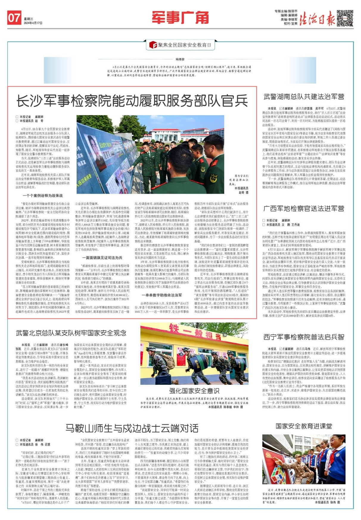 4月15日是第九個全民國家安全教育日,今年的活動主題為“總體國家安全觀·創(chuàng)新引領(lǐng)10周年”。連日來,軍地聯(lián)合通過戍邊戰(zhàn)士云端對話、武警官兵進(jìn)校園等多種形式,廣泛開展國家安全法律法規(guī)宣講活動。軍地法官、檢察官通過理論講解、以案說法、互動問答等送法進(jìn)軍營,營造依法維護(hù)國家安全的濃厚氛圍。