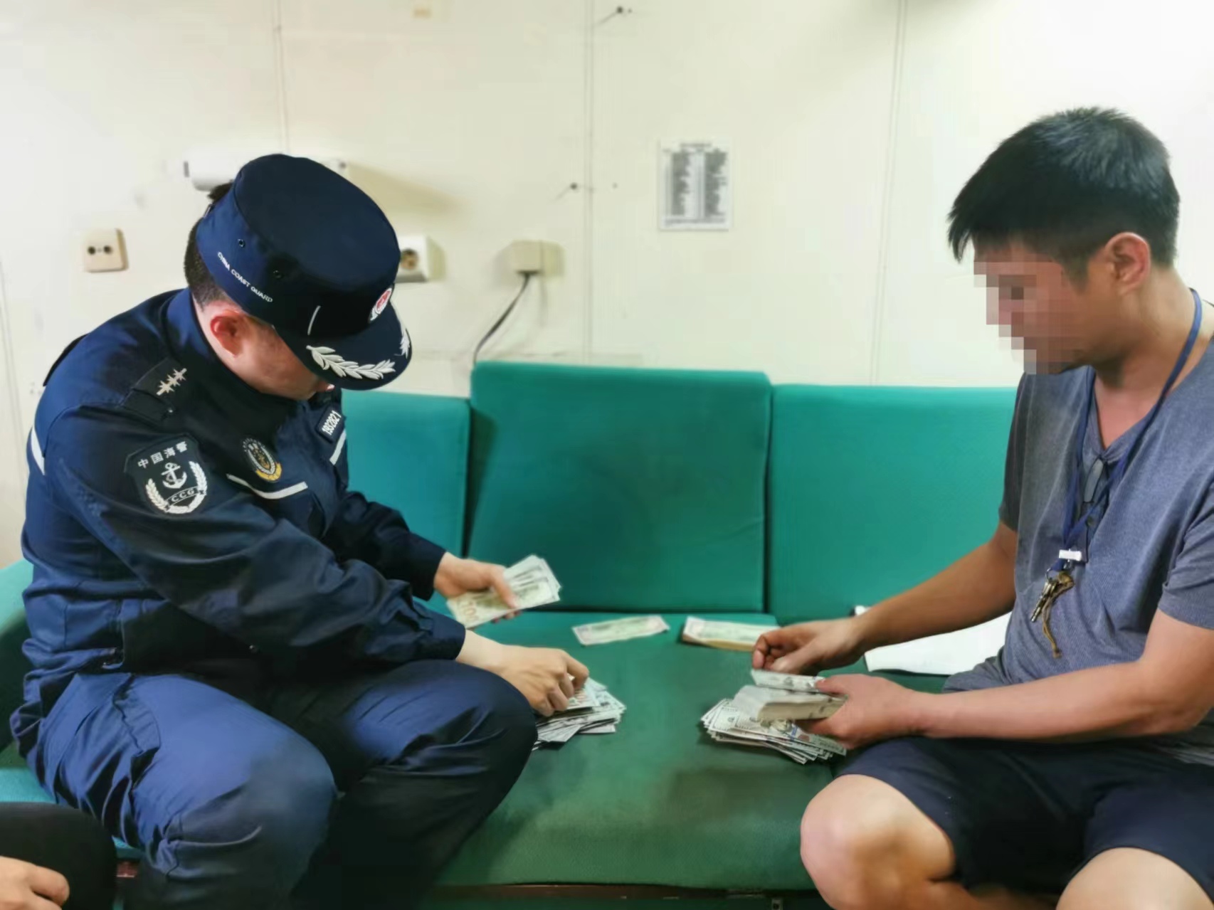圖為執(zhí)法員對違法所得的美金紙幣進行清點。