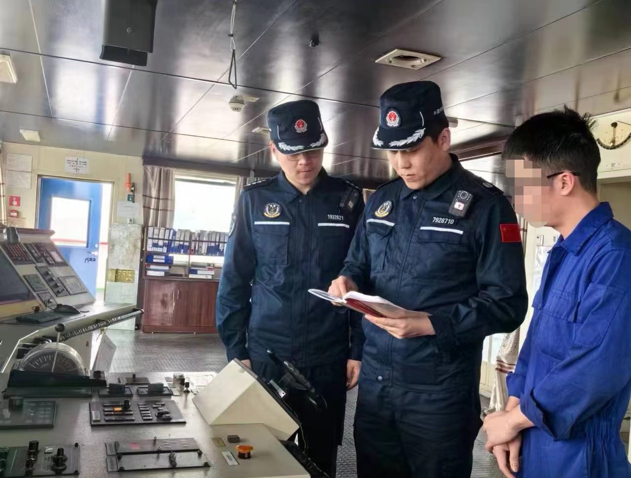 圖為執(zhí)法員對外籍貨輪進行現(xiàn)場檢查。