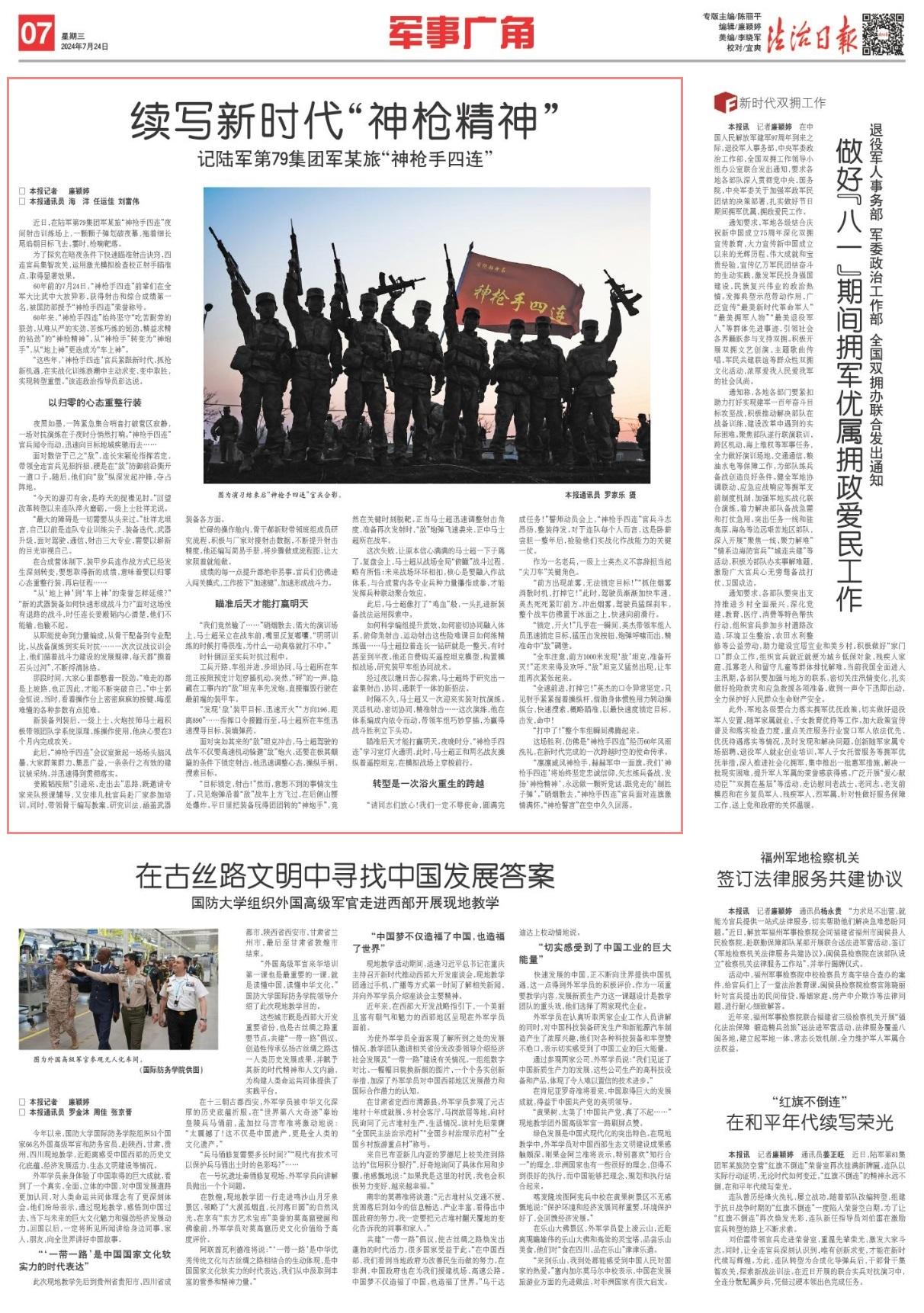 60年前的7月24日,“神槍手四連”前輩們?cè)谌姶蟊任渲写蠓女惒?,獲得射擊和綜合成績(jī)第一名,被國(guó)防部授予“神槍手四連”榮譽(yù)稱號(hào)。