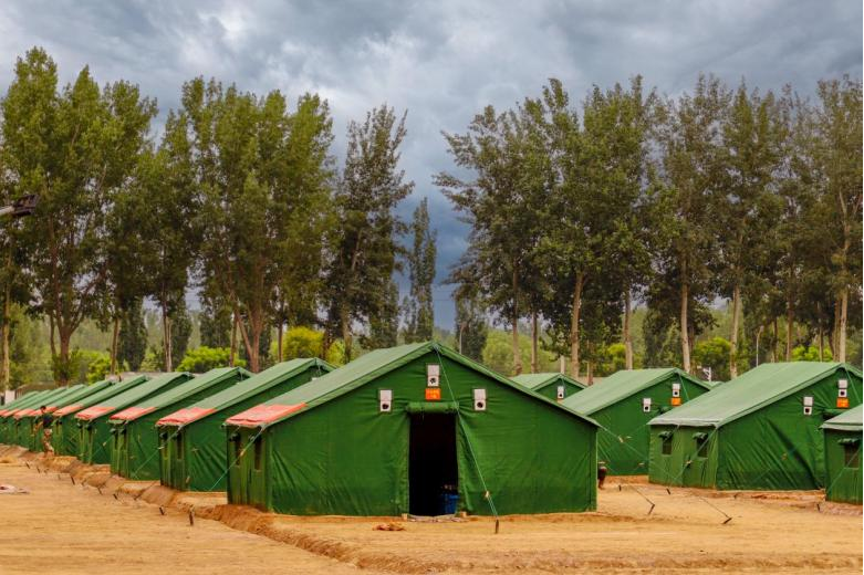 抵達(dá)駐訓(xùn)場(chǎng)后,各單位迅速展開(kāi)物資卸載、土地平整、通水通電、帳篷搭建等工作。