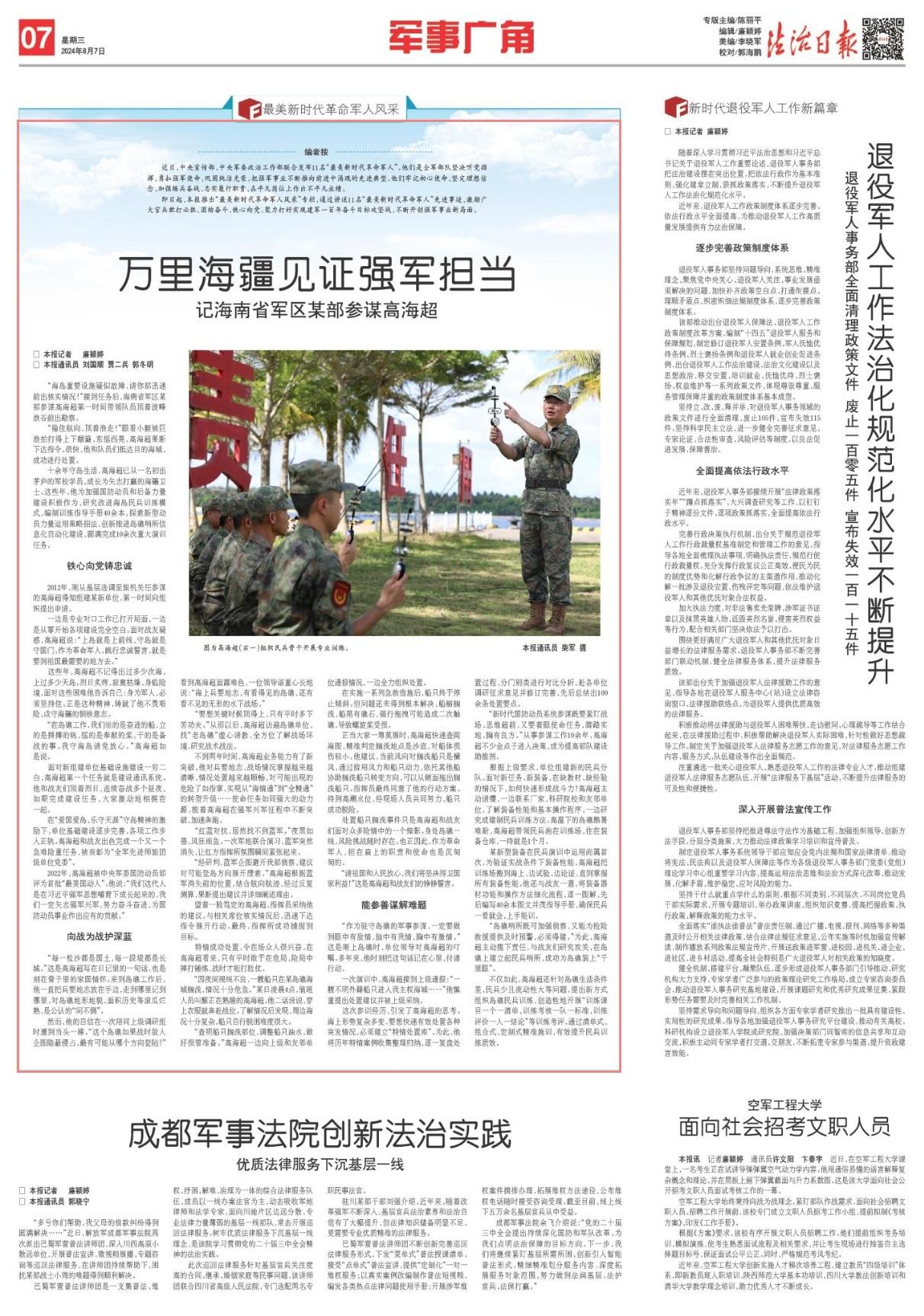 2022年,高海超被中央軍委國(guó)防動(dòng)員部評(píng)為首批“最美國(guó)動(dòng)人”。他說(shuō):“我們這代人是在習(xí)近平強(qiáng)軍思想哺育下成長(zhǎng)起來(lái)的,我們一定矢志強(qiáng)軍興軍,努力奮斗奮進(jìn),為國(guó)防動(dòng)員事業(yè)作出應(yīng)有的貢獻(xiàn)?!?/p>