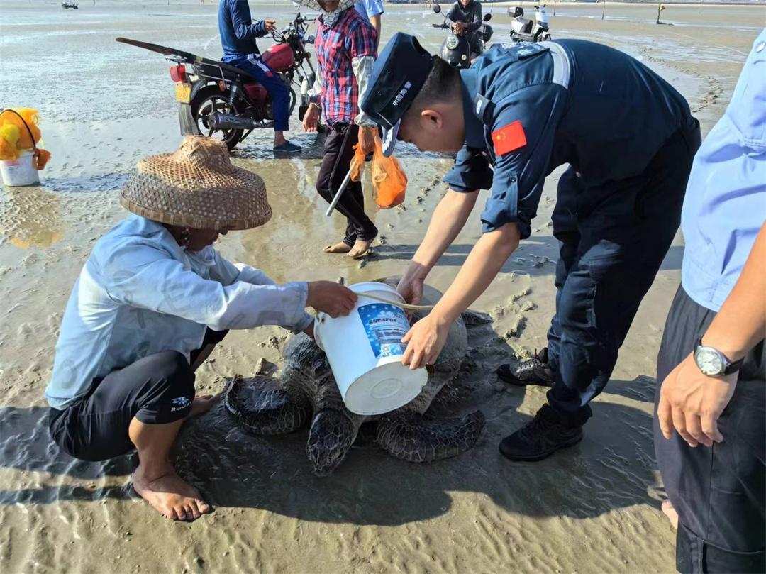 為避免綠海龜遭受二次傷害,執(zhí)法員一邊清理附近沙石雜物,一邊采用水桶澆水方式對其進行保濕。觀察一段時間后,綠海龜生命體征和行動能力開始逐漸恢復(fù),隨即被送至安全開闊海域放生。