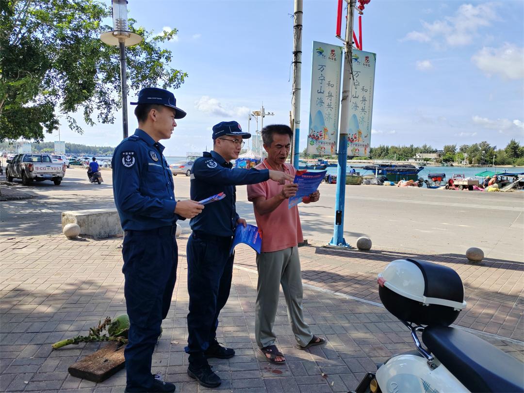 圖為8月14日,海南瓊海海警局在轄區(qū)碼頭進行法治宣傳,執(zhí)法員向漁民群眾介紹相關(guān)法律法規(guī)、舉報途徑等。