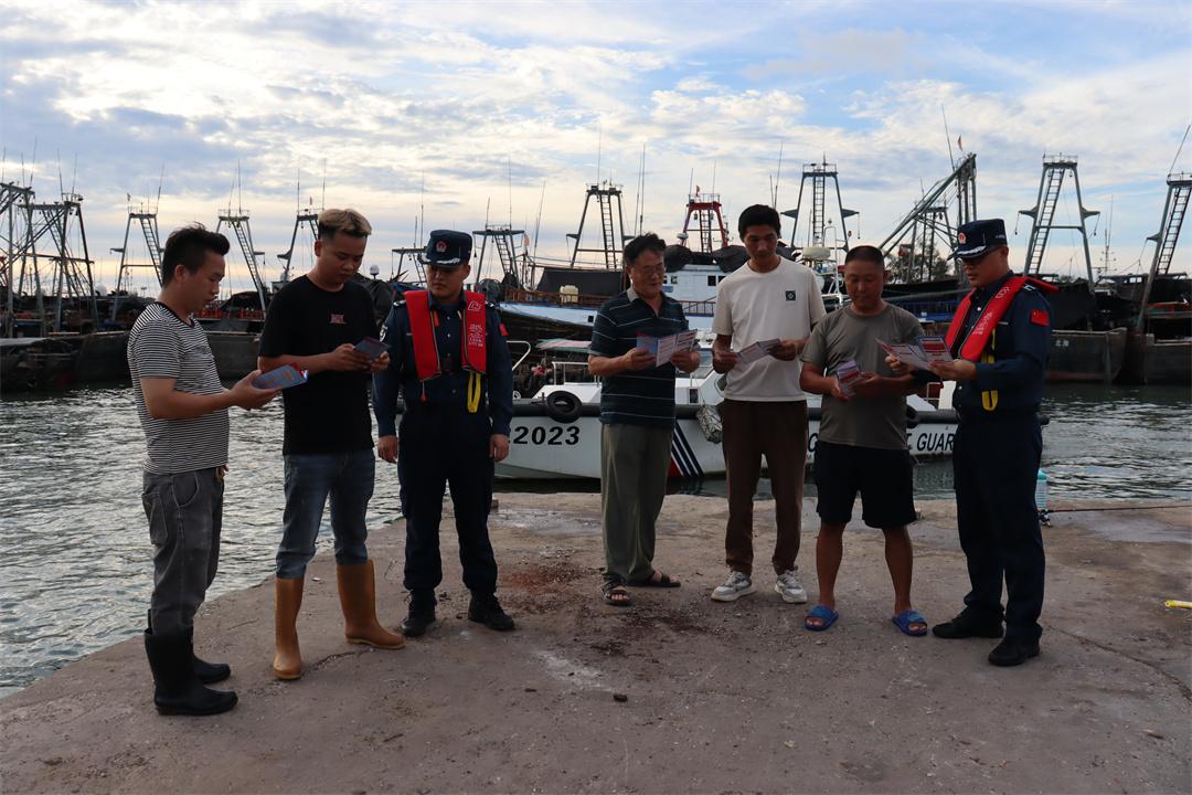 圖為8月15日,廣西北海海警局執(zhí)法員在開漁前夕深入轄區(qū)碼頭,向漁民宣傳海警法和相關(guān)政策。