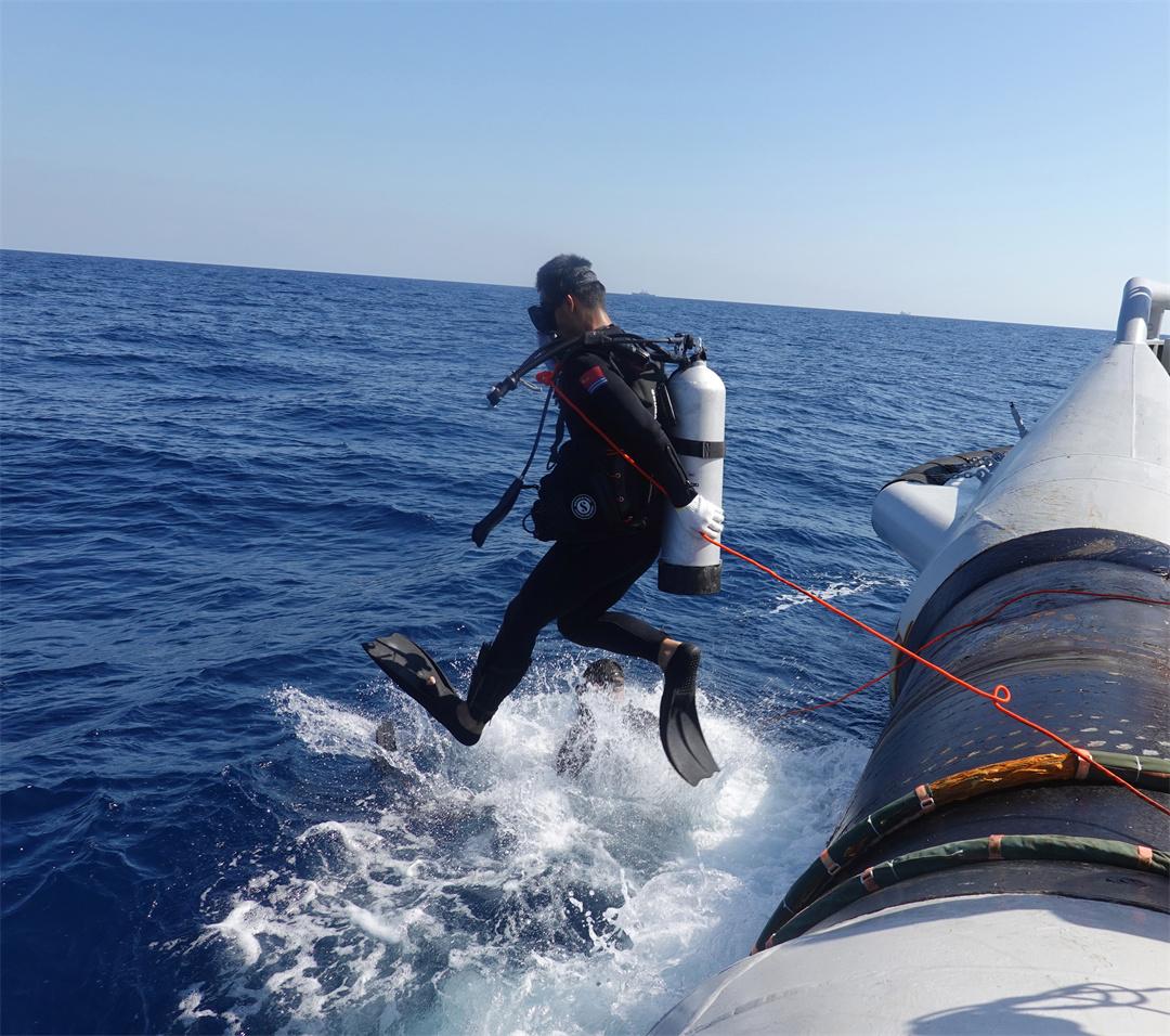 今年4月3日,正在訓(xùn)練的潛水員接到上級命令,立即由訓(xùn)轉(zhuǎn)戰(zhàn),奔赴鶯歌海西南海域執(zhí)行搜索“粵南澳漁36062”輪任務(wù)。通過與海軍特色醫(yī)療中心、南部戰(zhàn)區(qū)海軍第二醫(yī)院、海南三亞海警局、廣州打撈局、海南海事局等軍地單位協(xié)同合作,該支隊圓滿完成水面聯(lián)合搜索、遇難人員遺體打撈、碰撞事故水下取證等任務(wù),在實戰(zhàn)中檢驗了支隊核心救援能力。此次救援行動,是該支隊飽和潛水首次任務(wù)檢驗。