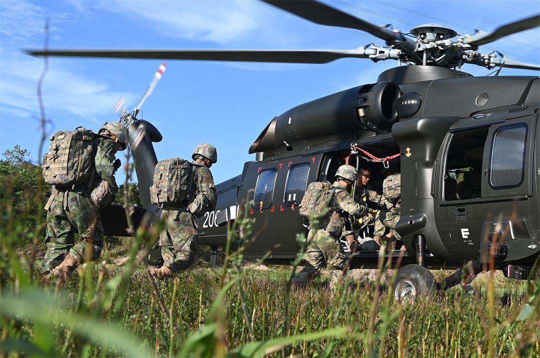 圖為直升機(jī)搭載作戰(zhàn)隊(duì)員飛赴機(jī)降地域。