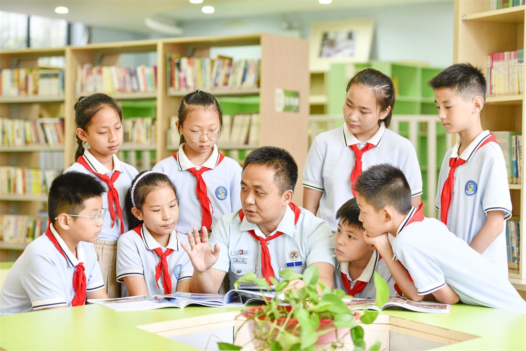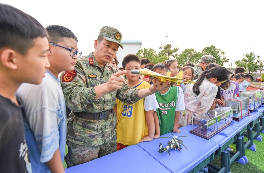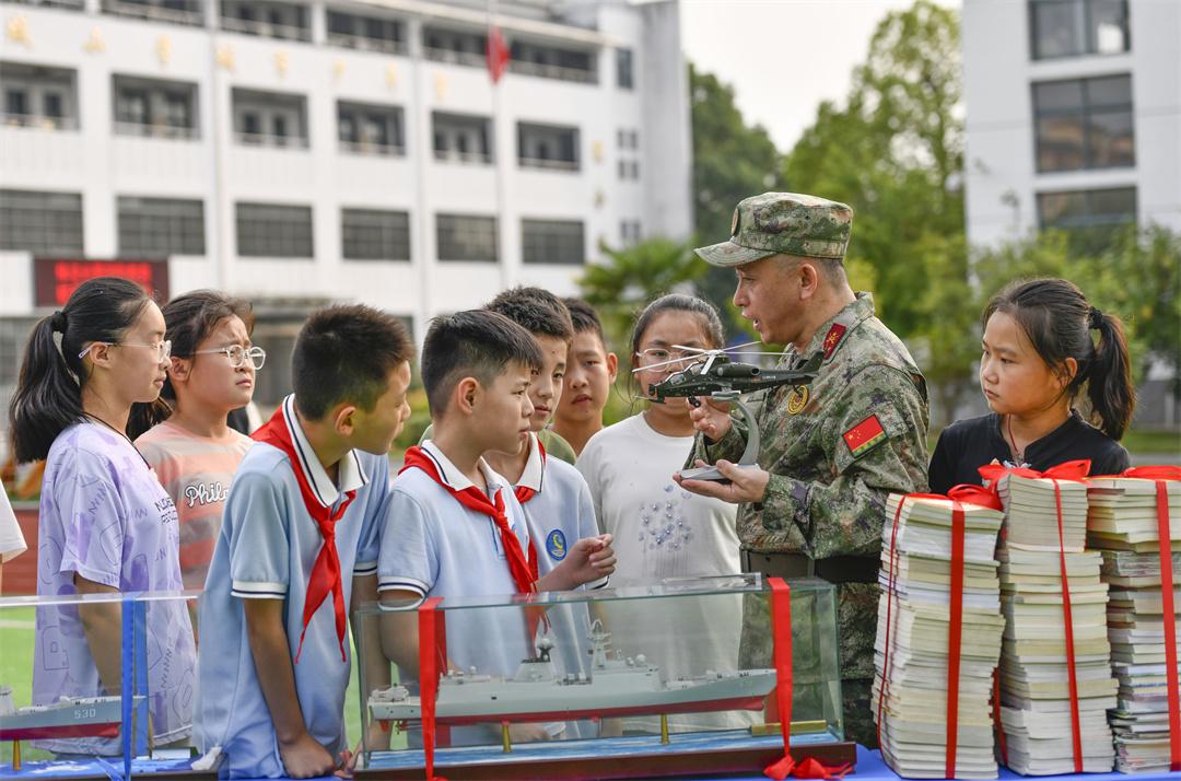 圖為合肥市廬陽(yáng)區(qū)人武部文職人員孫勁在向?qū)W生普及國(guó)防知識(shí)。